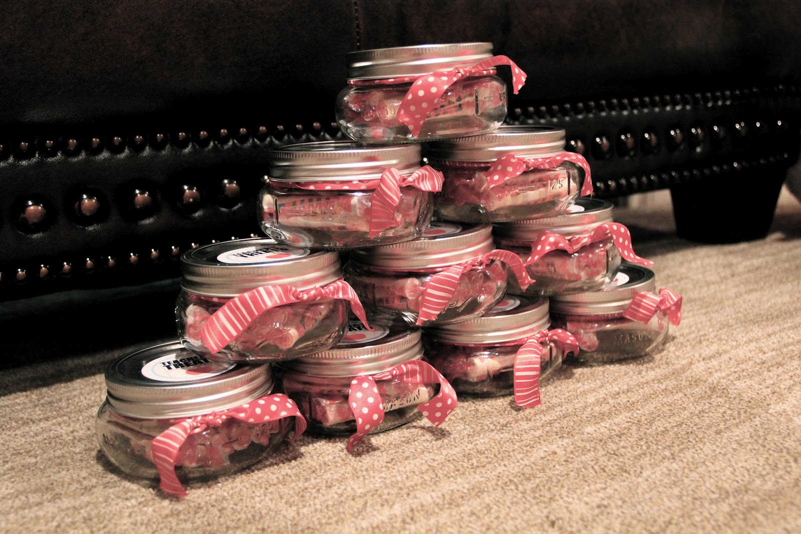 So I ended up using Mason jars: a. because I love them, and b. because I had a coupon to Joann's Fabric Store and they didn't have the treat jars, but I'm more than ok with it. Then I filled them with Smarties (*FYI: If I did it all over again, I may have chosen something with a little less of a defined shape, but I loved the play on words*) and then at the last minute I added some ribbon. Luckily, I cleaned out and organized all of our gift wrapping today, and remember that we had some leftover ribbon from Macy's birthday party that would match perfectly. On top of that, it was precut perfectly to tie nicely around the wide-mouthed jars. I just love when a plan comes together!